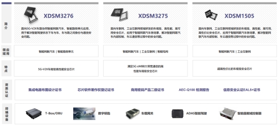 XDSM3275是面向车联网、工业互联网领域研发的高性能、高可靠、车规级安全芯片,应用于智能网联汽车各场景,解决智能网联汽车内部控制、车云通信等过程中的安全问题。